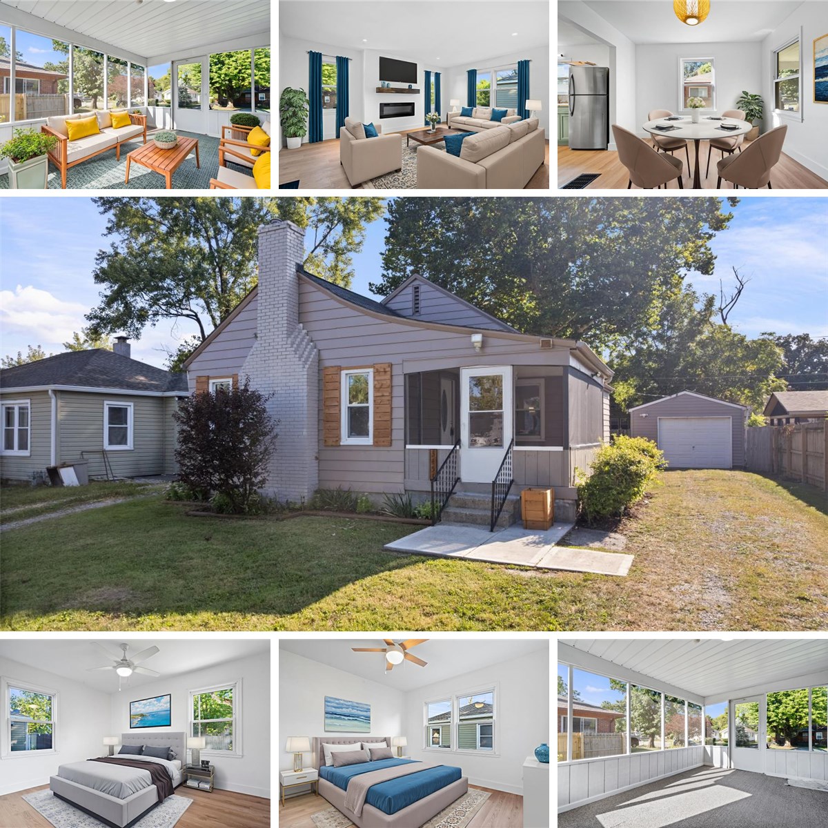 This renovated property features a freshly painted exterior, a screened front porch, back patio, and fenced backyard. Inside, you'll find an electric fireplace, stained wood mantel, and recessed lighting. The living spaces are drenched in natural light. The renovated kitchen features sage green cabinetry, a tile backsplash, butcher block countertops, floating shelves, a large pantry, & stainless steel appliances. The bathroom was fully replaced in 2025. There are two sizable bedrooms with new ceiling fans and closet doors. New lighting, flooring, doorknobs, outlets, and light switches. The large unfinished basement, complete with a waterproofing system, sump pump, & glass block windows, provides ample additional usable space. 1 car garage.